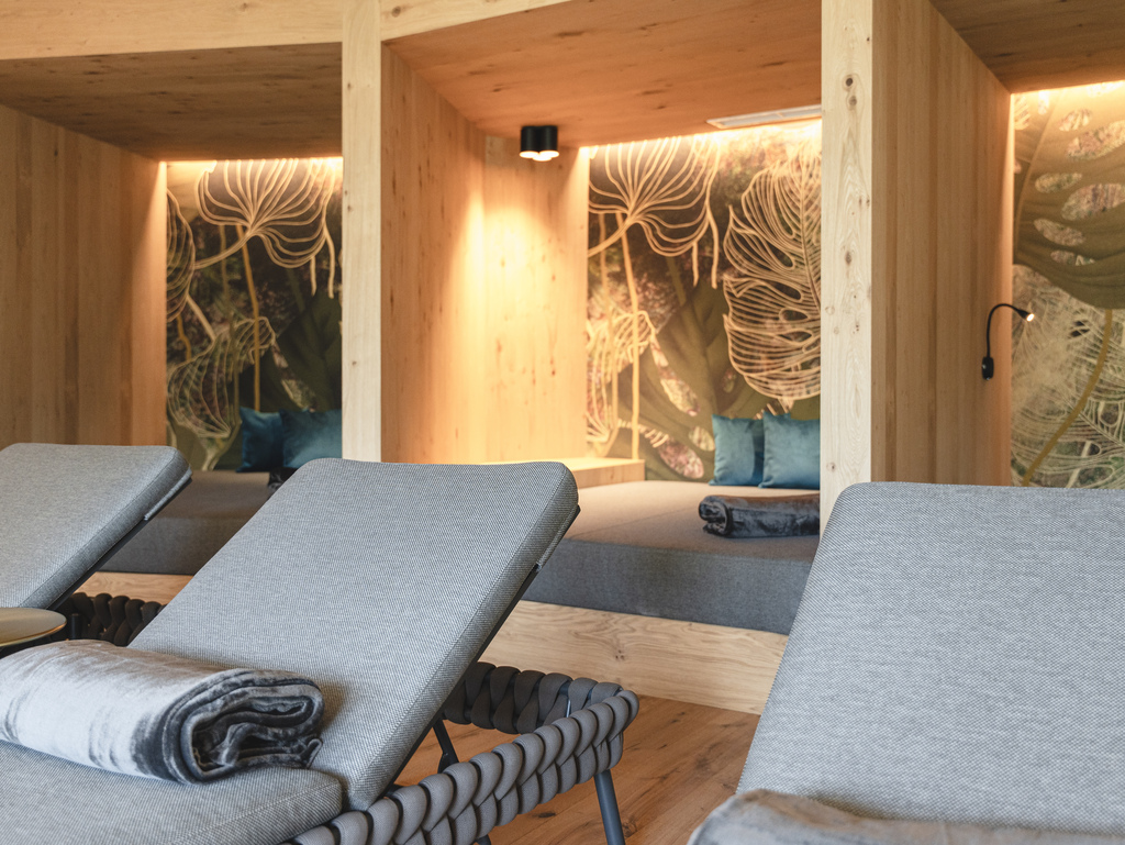 Unsere finnische und Bio-Sauna sowie der elegante Ruheraum laden dazu ein, Körper und Seele in wohltuender Wärme zu verwöhnen. Genießen Sie Augenblicke tiefer Ruhe mit Blick auf die Südtiroler Alpen.