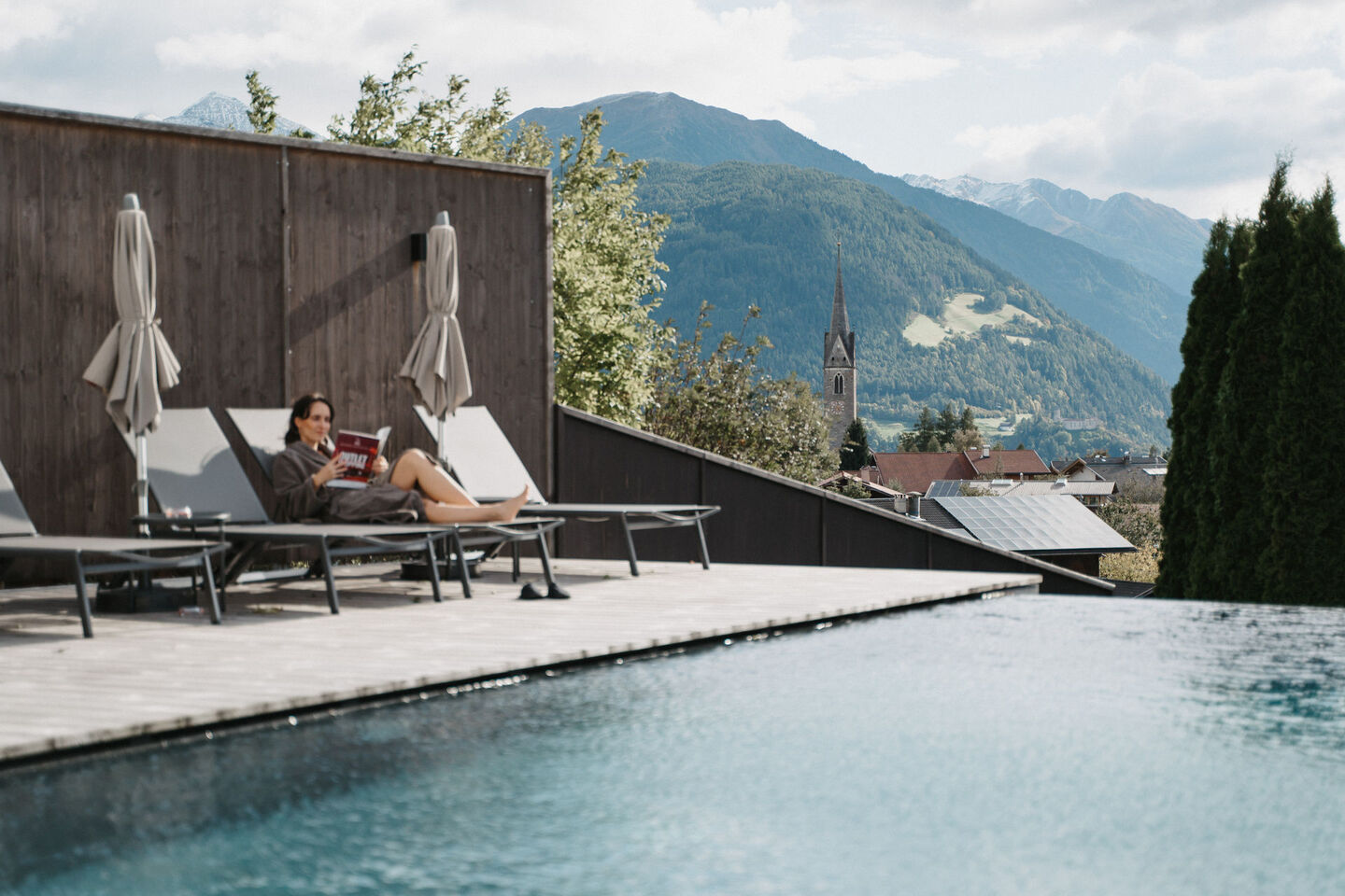 Im beheizten Außenpool gleiten Sie durch wohlig warmes Wasser, während sich die Berggipfel im Horizont erheben. Ein Platz, an dem Entspannung und die Magie der Natur ineinanderfließen.