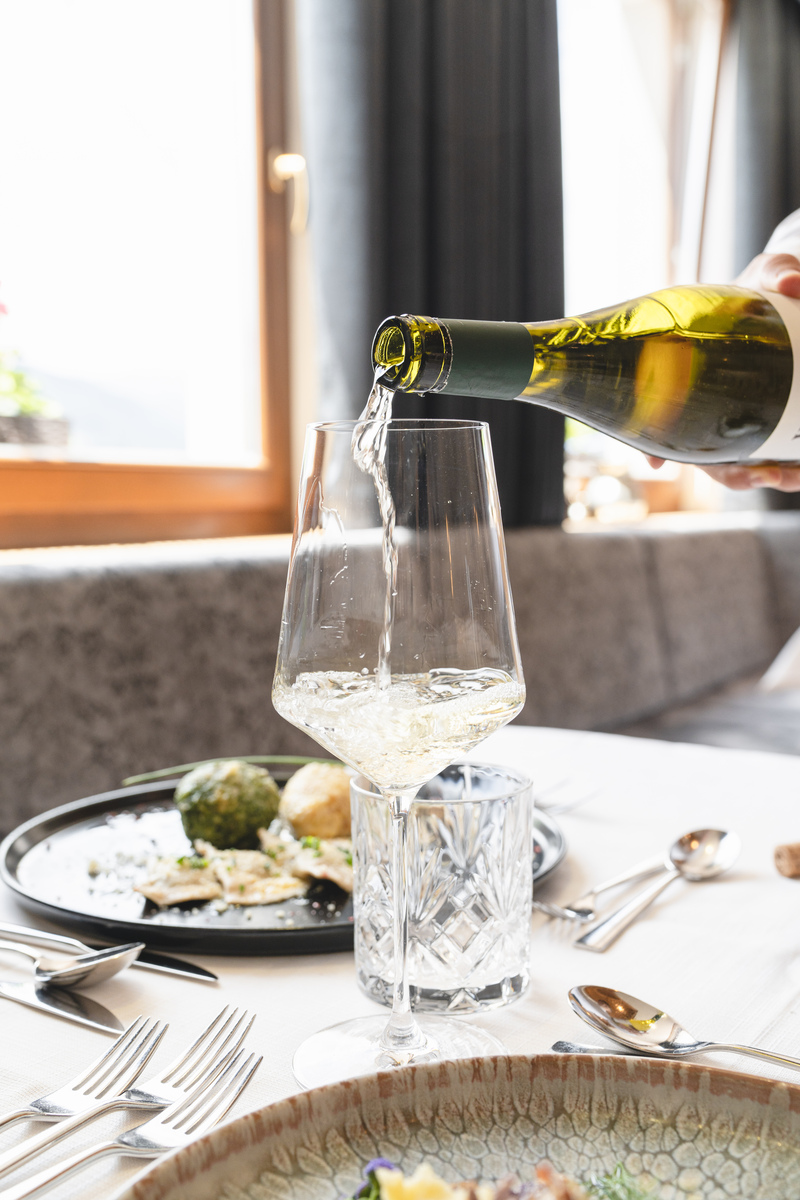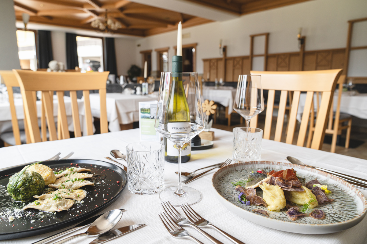 Im Panoramarestaurant des Lahnerhofs verschmelzen authentische Südtiroler Spezialitäten mit erlesenen Weinen. Kulinarischer Genuss und der weite Blick über die Berge schaffen eine Atmosphäre voller Romantik und Exklusivität.